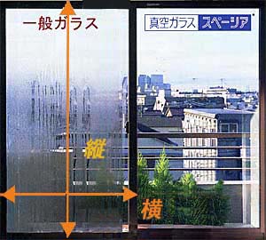 | 真空ガラス「スペーシア」は、6ミリの厚さのガラスの中に0.2ミリの真空層を持つ全く新しい発想のガラスです。この真空層が防露・断熱・防音に大きな効果を発揮し快適な居住空間をお約束します。省エネ効果も抜群です。 |